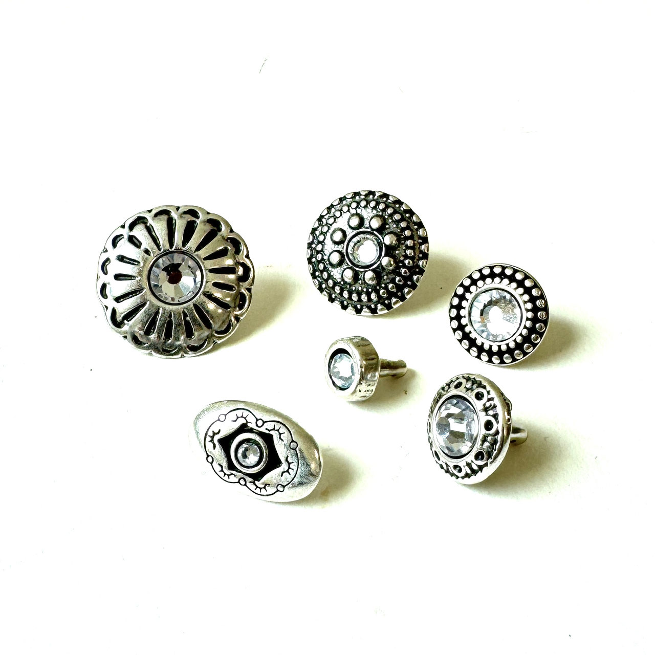 Campionario di tutte le borchie decorative con finitura Argento Vecchio e pietra sintetica color STRASS
